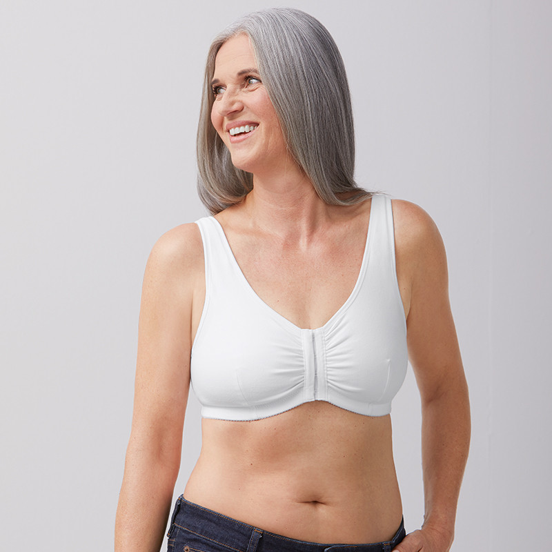 Ovaj jednostavan i udoban pamučni grudnjak s prednjim kopčanjem idealan je kao prvi grudnjak nakon operacije dojke. Bez žica, s mekanim širokim naramenicama koje ne pritišću, pruža potrebnu podršku i nježnost. Zahvaljujući velikim leđima dodatno pridonosi osjećaju sigurnosti i udobnosti, čak i tijekom spavanja. Ugrađeni obostrani džepići omogućuju nošenje prsne proteze. Praktičan, nježan i udoban. Dostupan i na doznaku HZZO-a.