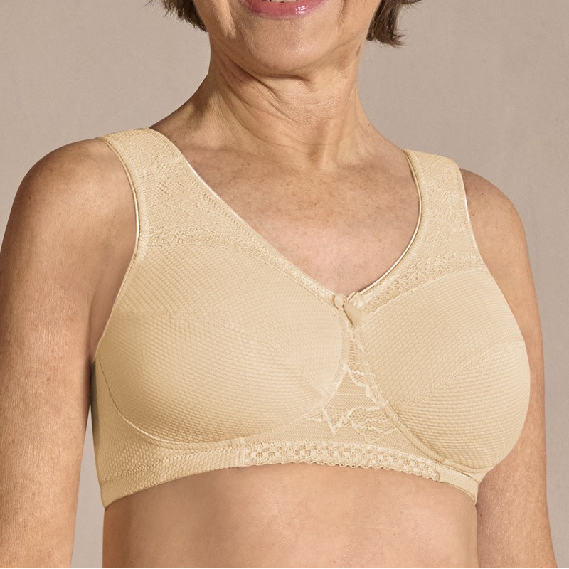 Mekani, bežični grudnjak s posebno širokim, podstavljenim naramenicama koje rasterećuju ramena i pružaju iznimnu udobnost. Strukturirana tkanina stvara blagi masažni učinak pri kretanju – idealan za limfnu potporu i osjetljivu kožu nakon operacije. Dvostruki džepići diskretno drže protezu na mjestu. Visoki stražnji dio za dodatnu stabilnost i pokrivenost.