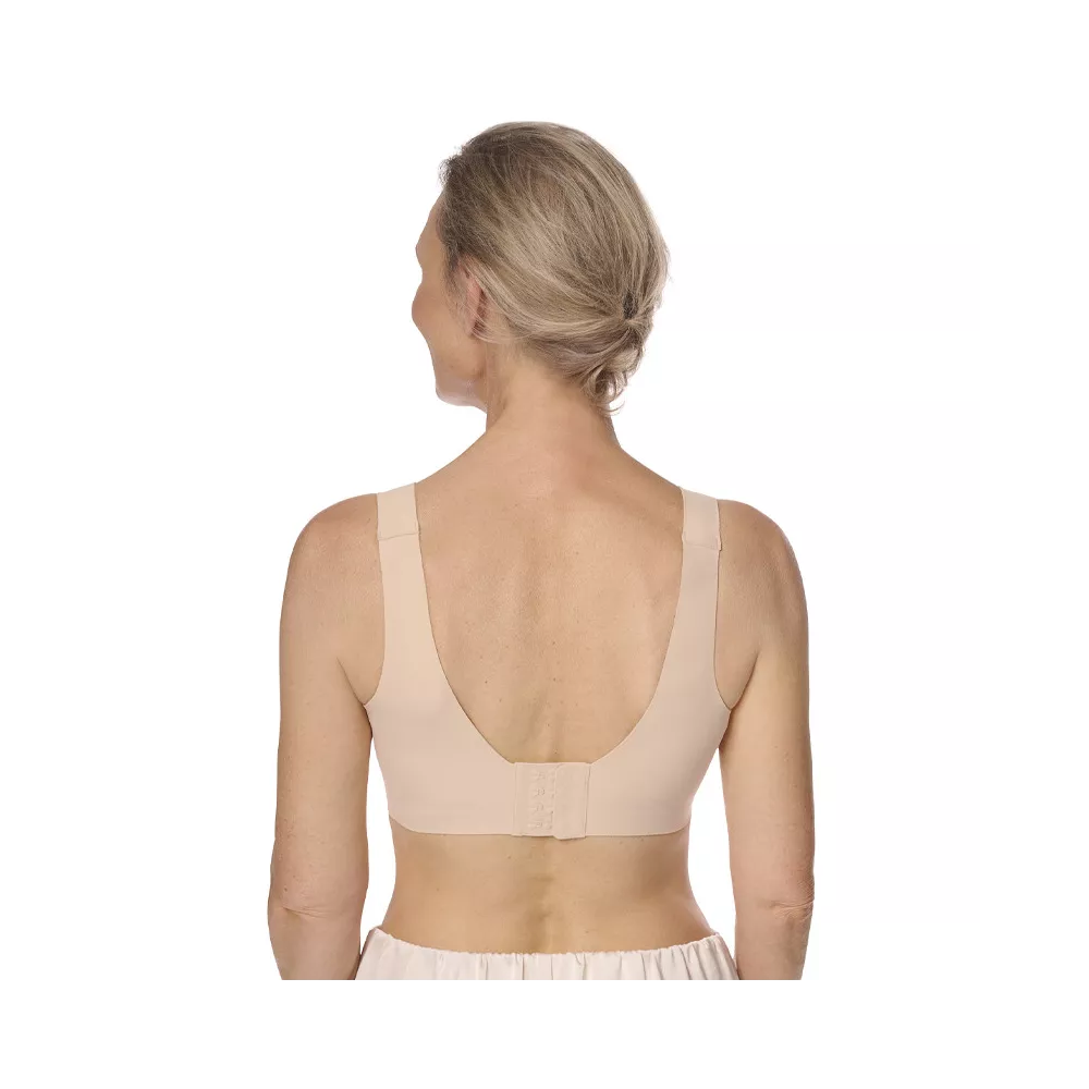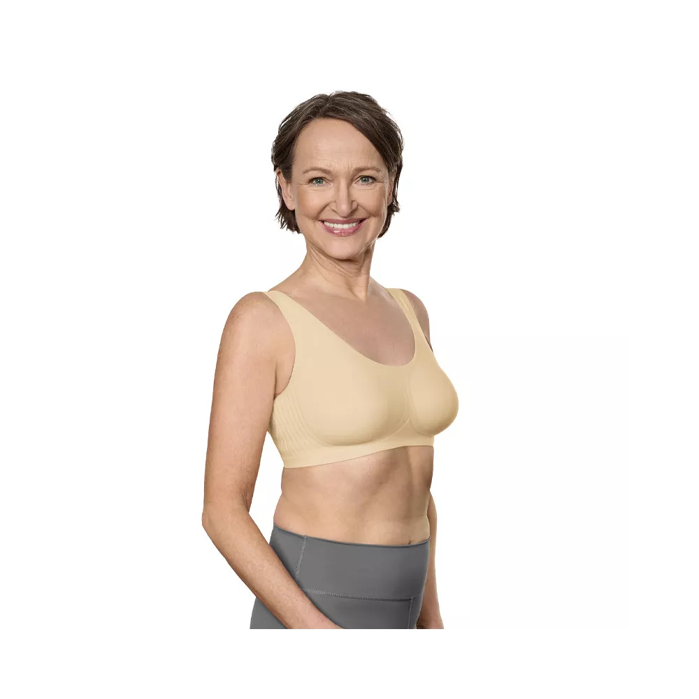 Mekani grudnjak koji sprječava urezivanje u kožu i podržava limfnu drenažu. Bez žica i šavova, s posebno širokim naramenicama koje rasterećuju ramena i pružaju iznimnu udobnost. Strukturirana tkanina stvara blagi masažni učinak pri kretanju – idealan za limfnu potporu i osjetljivu kožu nakon operacije. Obostrani džepići diskretno drže protezu na mjestu. Visoki bočni i stražnji dio za dodatnu stabilnost i pokrivenost.