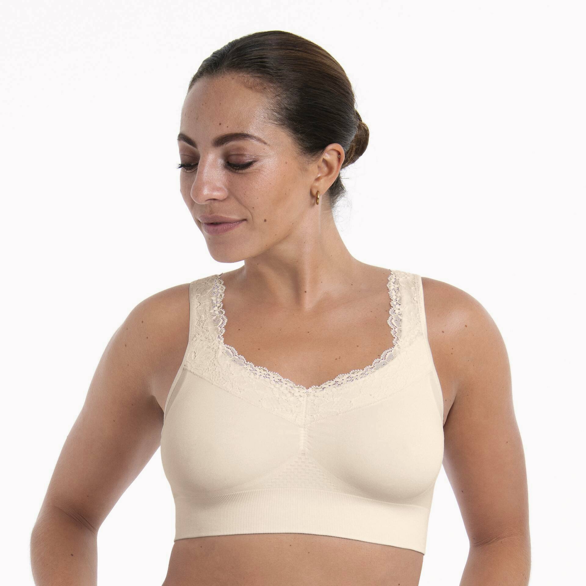 Obostrani džepići diskretno i sigurno drže silikonske proteze ili tekstilne umetke, a uklonjive spužvice nude dodatnu udobnost prema potrebi. Podesive naramenice omogućuju individualno prilagođavanje, a zahvaljujući svojoj nježnosti, Lotta Lace je savršen izbor za nošenje odmah nakon operacije, tijekom zračenja ili čak za spavanje.
