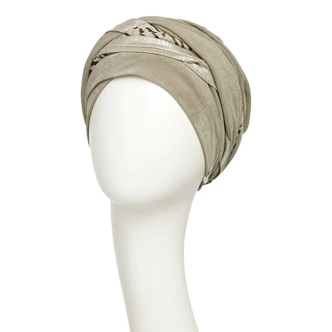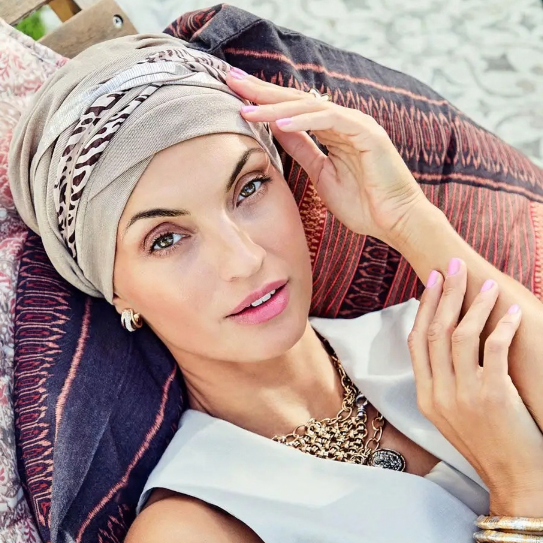 Turban PERLA se sastoji od 2 dijela – osnovnog turbana i bogate trake koja daje punoću i volumen ovom turbanu. Također, moći ćete ju nositi i kasnije, kada vam kosa počne rasti.