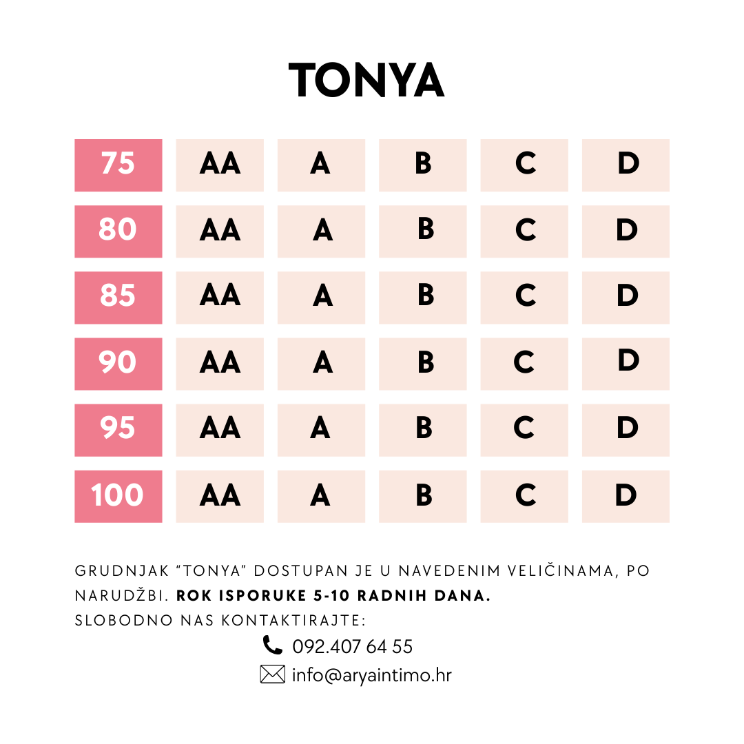 Grudnjak TONYA dostupan je po narudžbi u navedenim veličinama 75-100, AA-D košarice. Rok isporuke 5-10 radnih dana.